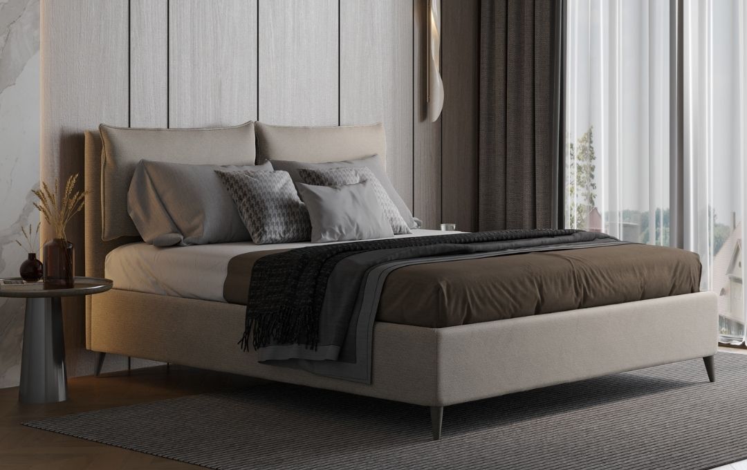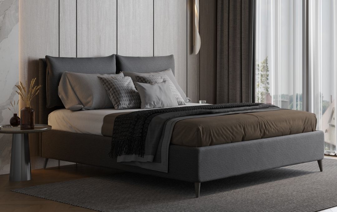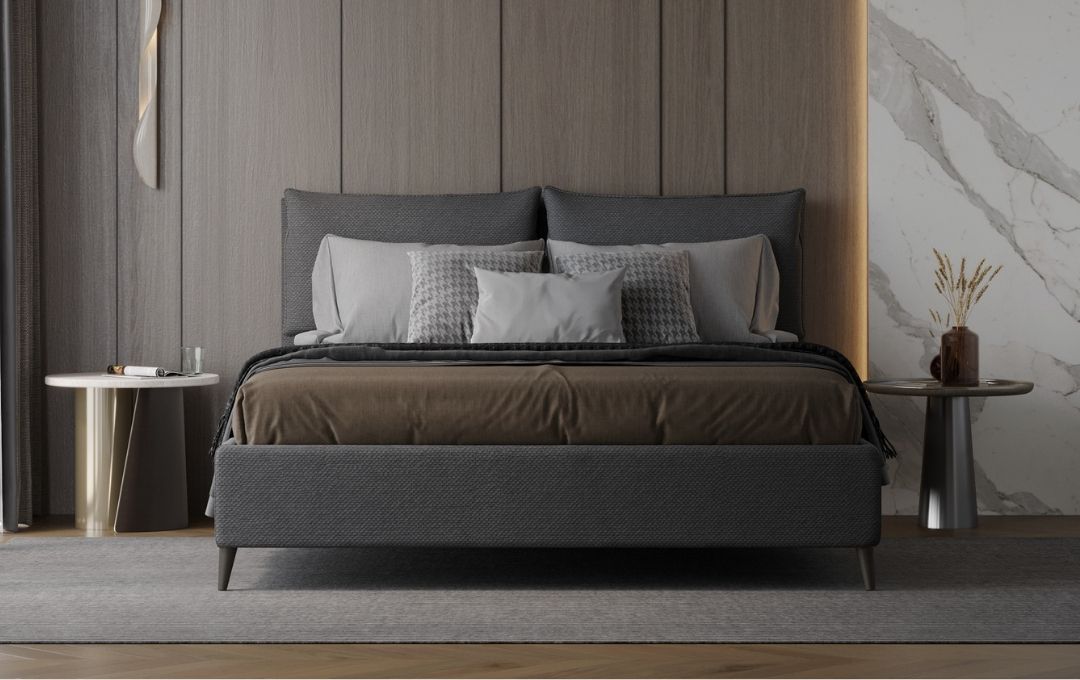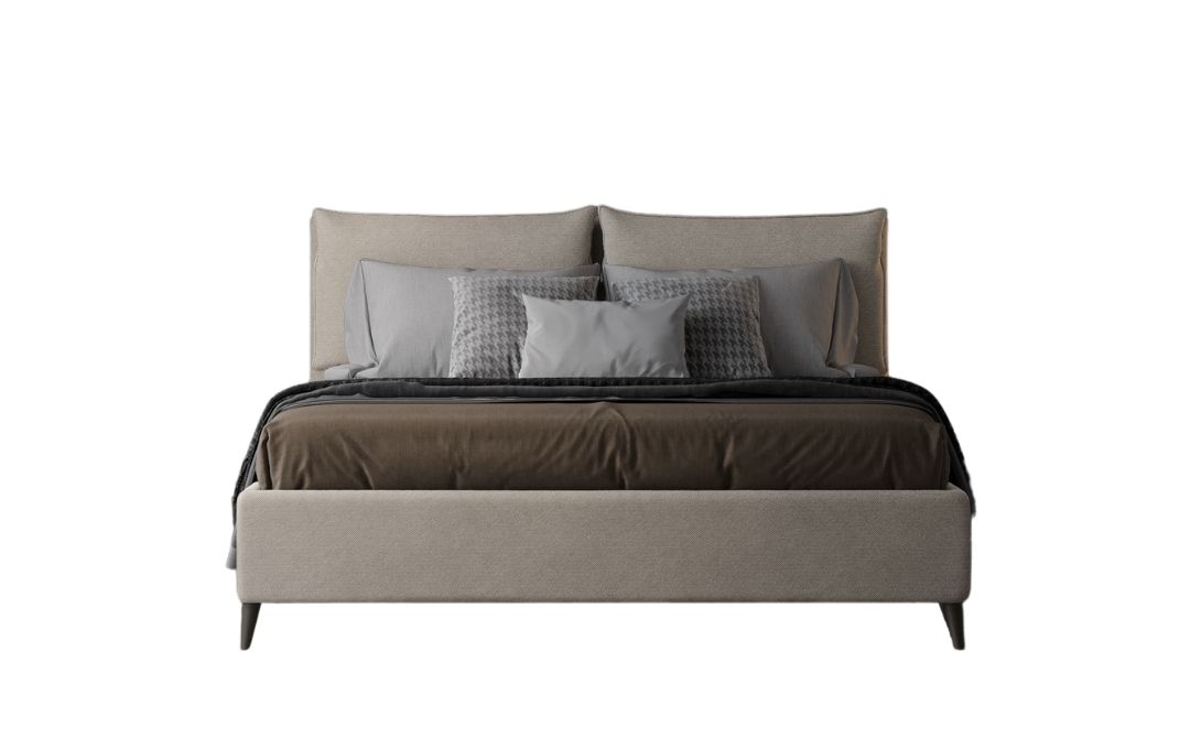 The Orchidea Veradea upholstered fabric bed features soft, welcoming lines thanks to the large cushions that define the headboard. Designed for those seeking superior comfort and relaxation, the Orchidea bed captivates you with its embracing design and sense of lightness that will define the entire bedroom atmosphere. The Orchidea bed is available with or without storage, to suit different space needs, and is fully removable. The storage model includes charcoal-colored plastic legs 13 cm high, and a lift-up slatted base mechanism. The non-storage version features elegant charcoal wooden legs 24 cm high. Both versions come with a wooden slatted base to ensure comfort and stability.