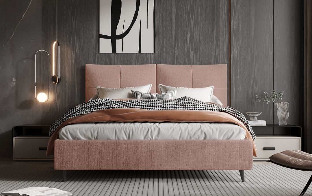 The Viola Veradea upholstered bed stands out for its elegant double-padded headboard panels, designed to enhance comfort and add a refined touch to your bedroom. The geometric stitching creates a soft, harmonious line that makes the bed both visually appealing and inviting. Every detail turns the Viola bed into a true statement piece, perfectly suited for both classic and modern interiors. This model features a spacious storage compartment to meet various needs. It comes with 13 cm high charcoal-colored plastic feet and a lift-up slatted mechanism. A wooden slatted bed base is included to ensure comfort and support.